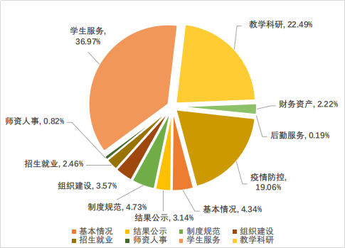 本学年度,学院主动公开信息约2072条。在主动公开的信息中,包括学院概况、学院领导、内部管理体制等基本情况类信息90条,占主动公开信息的比例为4.34%;会议纪要、干部任命、师生获奖奖项评定等结果公示类信息65条,占主动公开信息的比例为3.14%;各类办法、规定等制度规范类信息98条,占主动公开信息的比例为4.73%;党建方案、支部换届、党员发展等组织建设类信息74条,占主动公开信息的比例为3.57%;本研招生、学生就业类信息51条,占主动公开信息的比例为2.46%;团学活动、图书资源使用等学生服务类信息766条,占主动公开信息的比例为36.97%;师资队伍建设和人事任免类信息17条,占主动公开信息的比例为0.82%;各类教学活动安排,以及科研课题、评奖等教学科研类信息466条,占主动公开信息的比例为22.49%;财务制度、收费标准和资产管理等各类财务资产类信息46条,占主动公开信息的比例为2.22%;基建维修、招标采购等后勤服务类信息4条,占主动公开信息的比例为0.19%;新冠肺炎疫情防控数据、院疫情防控工作专报等疫情防控类信息395条,占主动公开信息的比例为19.06%。