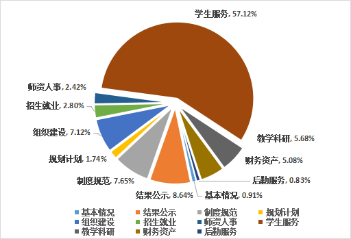 本学年度,学院主动公开信息约1320条。在主动公开的信息中,包括学院概况、学院领导、内部管理体制等基本情况类信息12条,占主动公开信息的比例为0.91%;会议纪要、干部任命、师生获奖奖项评定等结果公示类信息114条,占主动公开信息的比例为8.64%;各类办法、规定等制度规范类信息101条,占主动公开信息的比例为7.65%;党建方案、支部换届、党员发展等组织建设类信息94条,占主动公开信息的比例为7.12%;本研招生、学生就业类信息37条,占主动公开信息的比例为2.8%;团学活动、图书资源使用等学生服务类信息754条,占主动公开信息的比例为57.12%;师资队伍建设和人事任免类信息32条,占主动公开信息的比例为2.42%;各类教学活动安排,以及科研课题、评奖等教学科研类信息75条,占主动公开信息的比例为5.68%;财务制度、收费标准和资产管理等各类财务资产类信息67条,占主动公开信息的比例为5.08%;基建维修、招标采购等后勤服务类信息11条,占主动公开信息的比例为0.83%。