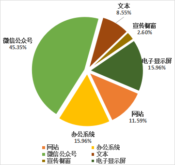 在主动公开的信息中,通过校园网及院外有关机构及部门网站(中直采购网、国家研招网等)方式进行公开的信息183条,占主动公开信息的比例为11.59%;通过院内办公系统方式公开的信息252条,占主动公开信息的比例为15.96%;通过文本方式公开的信息135条,占主动公开信息的比例为8.55%;通过宣传橱窗公开的信息41条,占主动公开信息的比例为2.6%;通过电子显示屏公开的信息252条,占主动公开信息的比例为15.96%;通过微信公众号公开的信息716条,占主动公开信息的比例为45.35%。