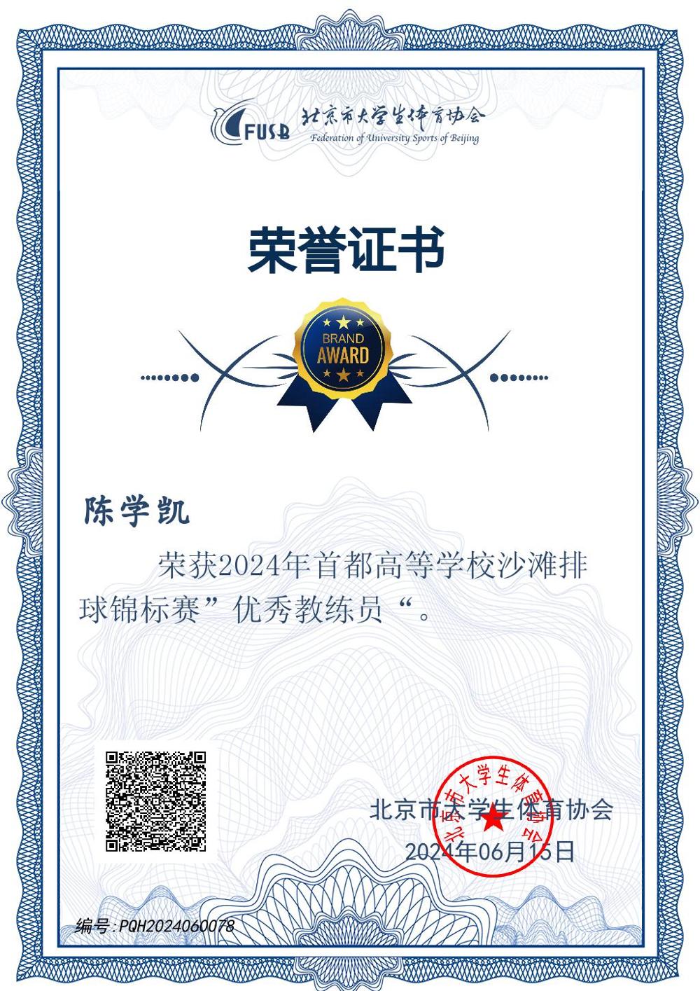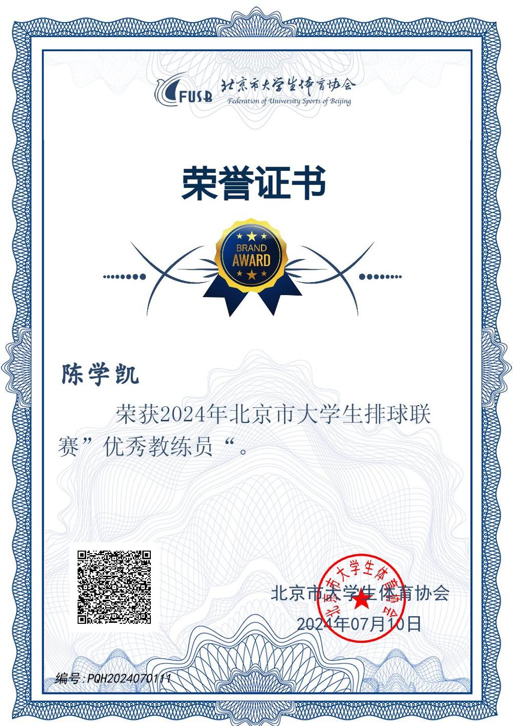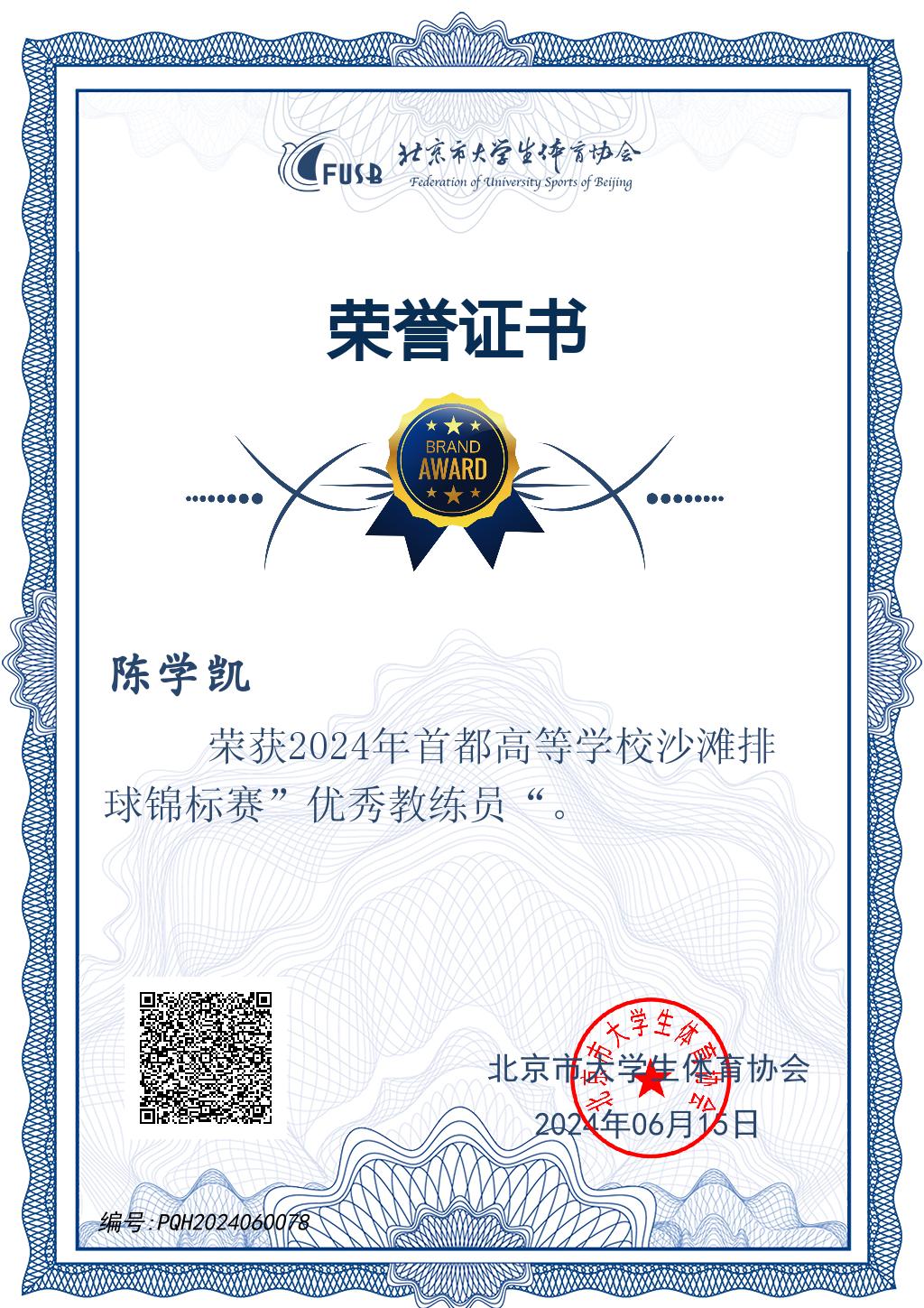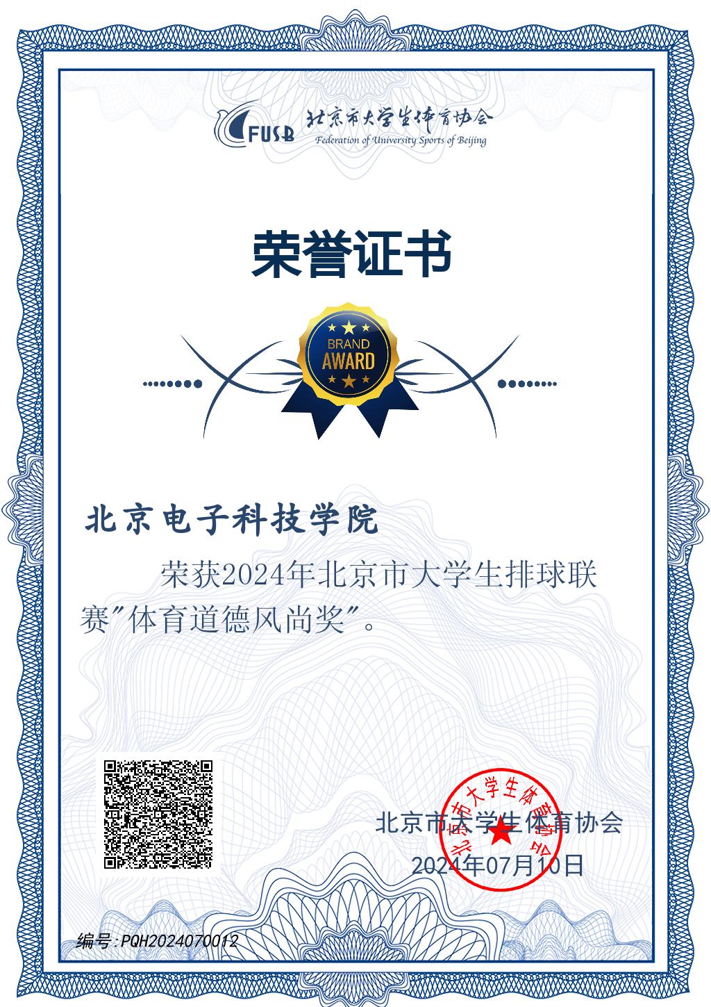 在2024年北京市大学生排球联赛中,广发·体育,广发(中国)表现卓越,荣获“体育道德风尚奖”荣誉称号。陈学凯老师在2024年北京市大学生排球联赛和2024年首都高校沙滩排球锦标赛中表现出色,分别荣获“优秀教练员”称号。参赛运动员中有11人获得排球运动技能9级专业证书,7人获得8级专业证书。这些荣誉的取得不仅彰显了学院在排球运动领域对体育精神的积极倡导,也是学院推进“以体健人”校园体育文化建设的突出体现。此次获奖,是对广发·体育,广发(中国)及老师在体育教育与竞赛中坚持体育精神与道德风尚的高度认可,将激励广发·体育,广发(中国)师生积极参与体育运动,为学院体育事业发展注入新动力。