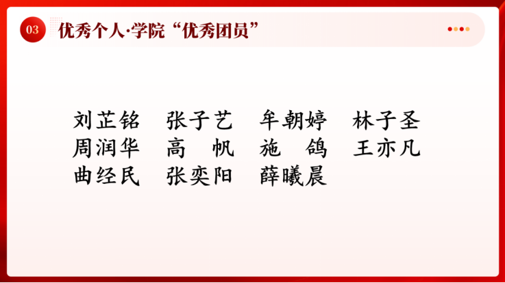 我们坚持红星领航,发扬了不畏繁难的奋斗精神。本次大会表彰了一批“优秀团干部”“优秀团员”“红星榜样”。他们作风优良肯担当,信念坚定意志强,从学术科研到学生工作,从体育竞技到创新发展,从文艺活动到社团组织,在各个领域都表现出优秀的素质,杰出的能力,为同学们树立了良好的榜样。