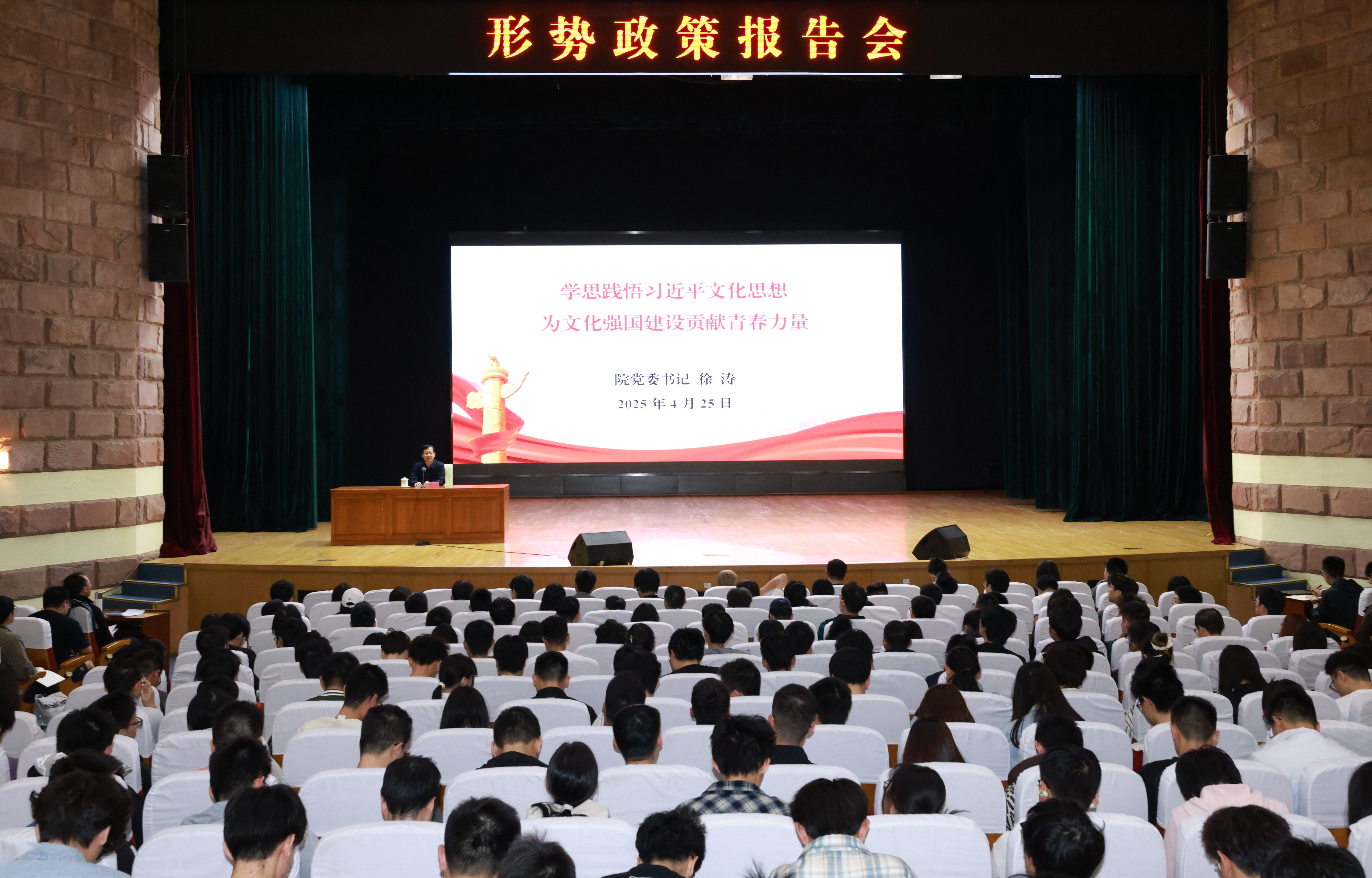 425日下午,院党委书记徐涛以“学思践悟习近平文化思想 为文化强国建设贡献青春力量”为题为全2000名学生作形势政策报告。报告围“什么是习近平文化思想”、“为什么要建设文化强国”、“为什么要坚持党的文化领导权”、“为什么要牢牢掌握舆论主导权”、“为什么说‘两个结合’是我们取得成功的最大法宝”、“物质富有了,精神就会富有吗”、“为什么要培育和践行社会主义核心价值观”等7个问题作辅导,并结合学院人才培养实际和学生成长需要,向学生提出担当青年文化使命的殷切期望,帮助学生深刻领悟习近平文化思想、自觉增强文化自信。