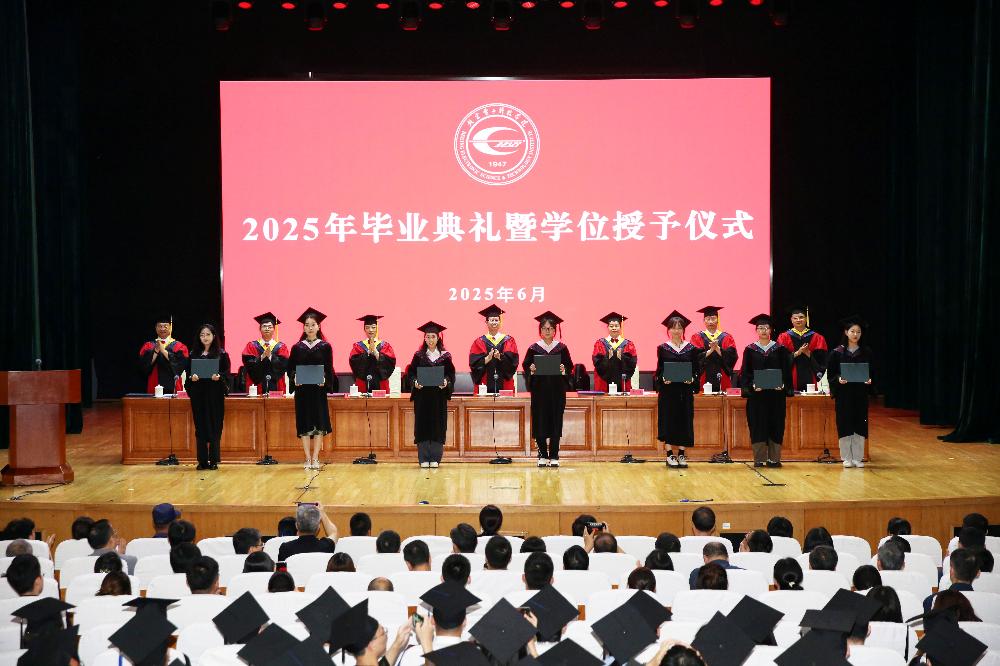 典礼上,院领导宣读了《学院关于表彰2025届优秀毕业生的决定》和优秀毕业生名单为优秀毕业生颁发荣誉证书,为毕业生代表颁发学位证书并拨穗。毕业生代表向教师和服务保障人员代表献花,本科毕业生、研究生毕业生、教师代表先后发言。党委副书记、院长肖嵩代表学院向2025届全体毕业生圆满完成学业表示热烈祝贺,提出殷切期望:一要忠诚,忠于祖国,忠于人民;二要励志,立鸿鹄志,做奋斗者;三要求真,求真学问,练真本领;四要力行,知行合一,做实干家。